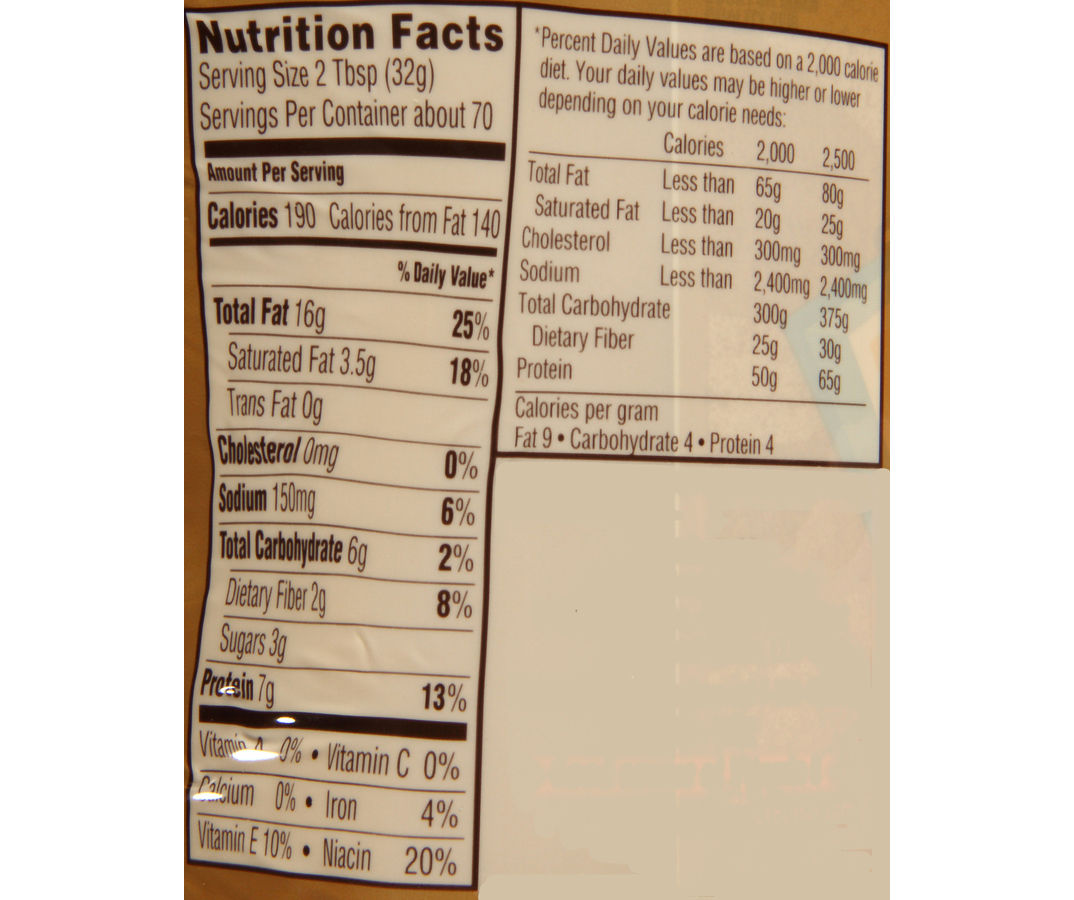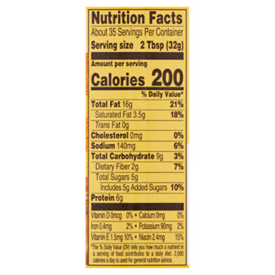 Skippy Peanut Butter, Natural, Creamy - Fooducate Nutrition Serving Size: 2 Tbsp (32g) Amount per Serving My Daily Value Calories 190 Kcal 11% Total Fat 16 g 25% Saturated Fat 3.5 g 21% Trans Fat 0 g 0% Cholesterol 0 mg 0% Sodium 150 mg 7% Potassium 90 mg 2% Total Carbohydrate 6 g 3% Dietary Fiber 2 g 8% Sugars 3 g 4% Added Sugars 2 g 8% Protein 7 g 15% Calcium 0 mg 0% Iron 0.36 mg 2%