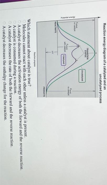14.7: Catalysis - Chemistry LibreTexts This graph compares potential energy diagrams for a single-step reaction in the presence and absence of a catalyst. The only effect of the catalyst is to lower the activation energy of the reaction. The catalyst does not affect the energy of the reactants or products (and thus does not affect ΔE). (CC BY-NC-SA; anonymous) PDF AP CHEMISTRY 2006 SCORING GUIDELINES - Unauthorized In process 2, covalent bonds (or sigma bonds, or electron-pair ... Consider the four reaction-energy profile diagrams shown below. (i) Identify the two diagrams that could represent a catalyzed and an uncatalyzed reaction pathway for the same reaction. Indicate which of the two diagrams represents the catalyzed reaction pathway for