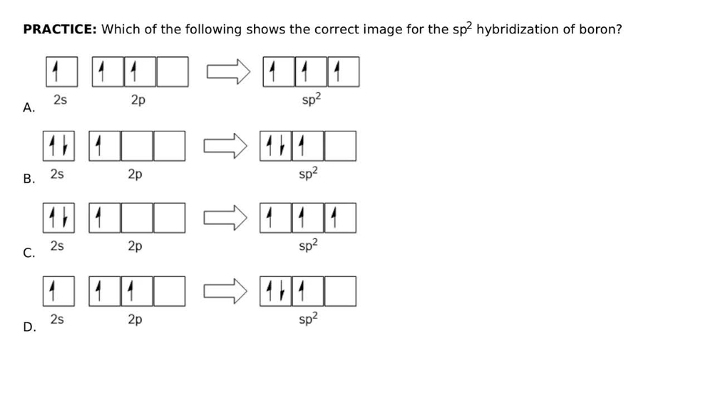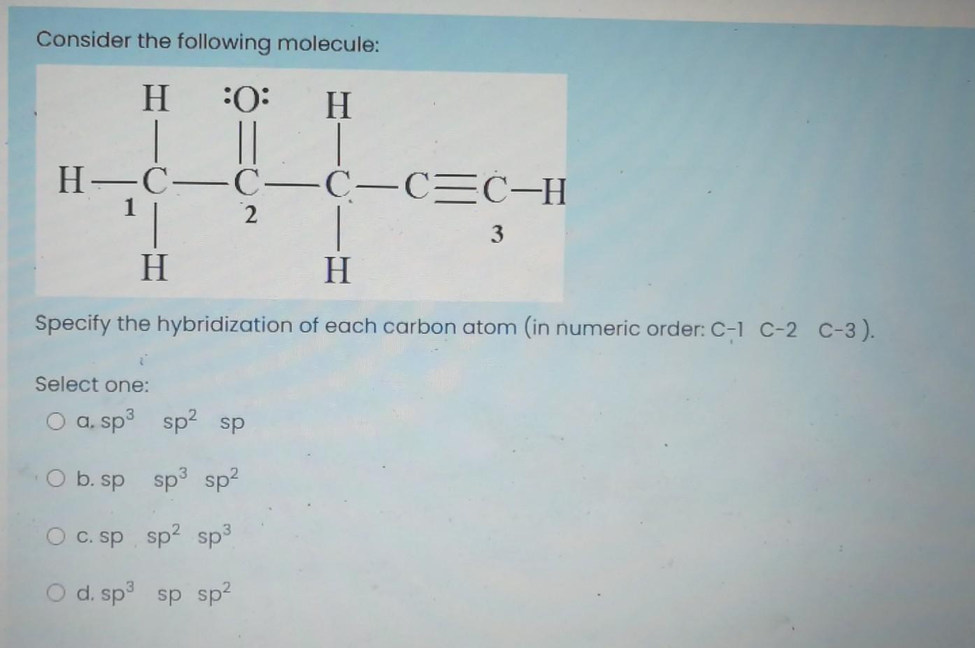 label each carbon atom with the appropriate hybridization 🚀To book a personalized 1-on-1 tutoring session:👉Janine The Tutorhttps://janinethetutor.com🚀More proven OneClass Services you might be interested in:👉One... Hybridization of Carbon - Molecular Geometry and Bond Angles -... Carbon can have an sp hybridization when it is bound to two other atoms with the help of two ... Finding the hybridization of atoms in organic molecules (worked... There is no general connection between the type of bond and the hybridization for all molecules but since in organic chemistry it is only the hybridization of carbon which we need to know, we get the following connection-Single bonded carbon is sp3 hybridized. Double bonded carbon is sp2 hybridized. Triple bonded carbon is sp hybridized.